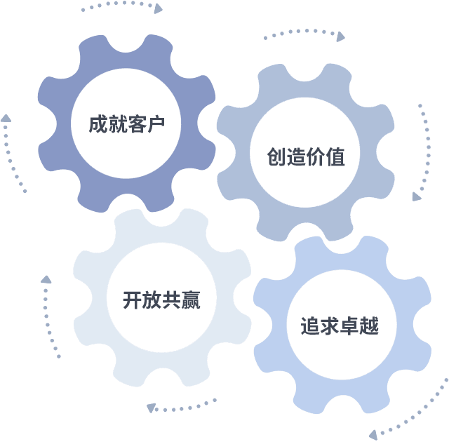 成就客户是一切决策的出发点,,,创造价值是衡量所有工作的标准,,追求卓越是我们做事做人的态度,,开放共赢是我们的格局也是最终的结果。。。。价值观的齿轮环环相扣,,,推动着组织里的每个人不断向前。。。